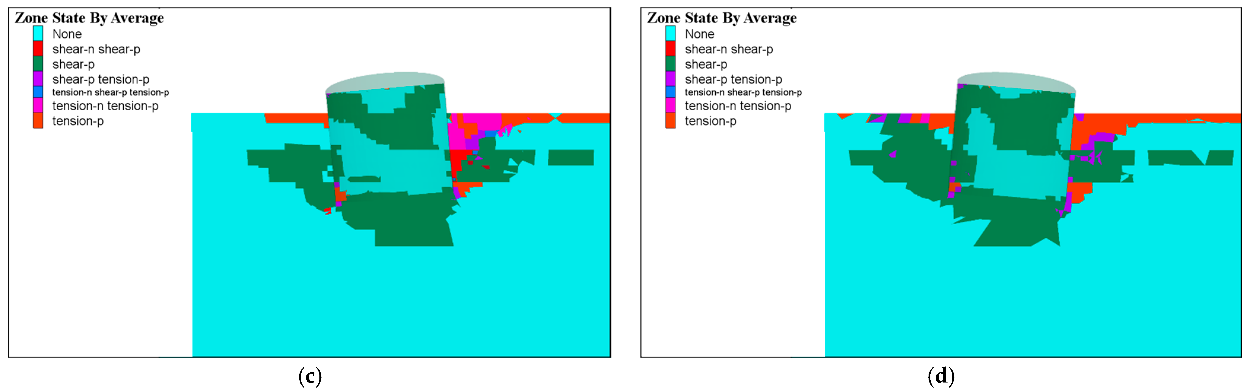 Figure 7. Plastic zones in surrounding soils under varying conditions from numerical simulations with 10-year ULS loading (safety factor 2.0), illustrating progressive expansion: (a) foundation under 0 m scour condition; (b) foundation under 2 m scour condition; (c) foundation with 2 m scour and −5° tilt error; (d) foundation with 2 m scour and +5° tilt error.