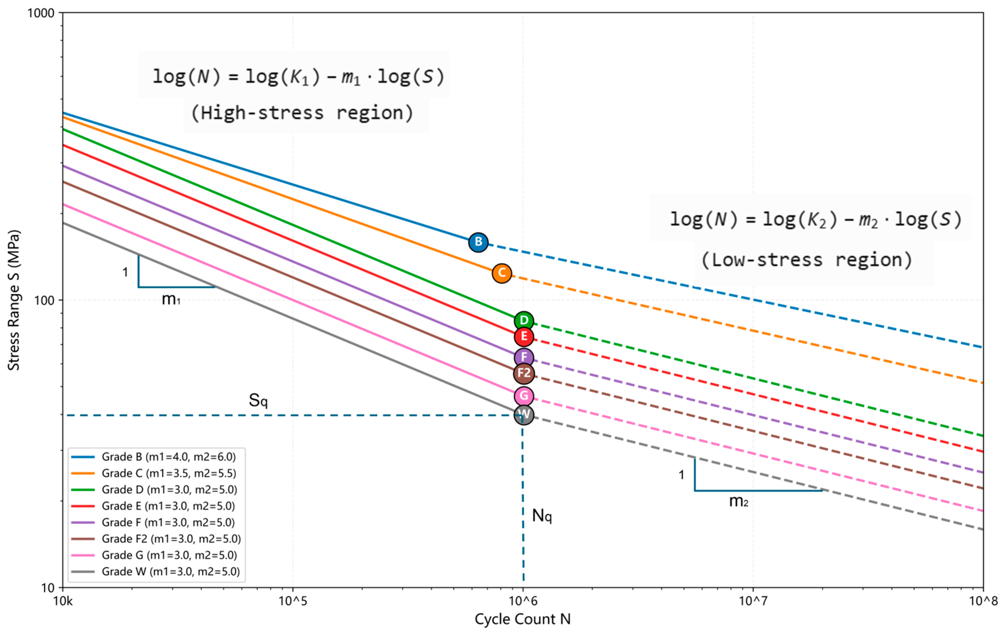 Fatigue Analysis ZoneCycles (N)Stress Range (MPa)S–N CurveCalculated Fatigue DamageSafety FactorDesign Fatigue Damage
