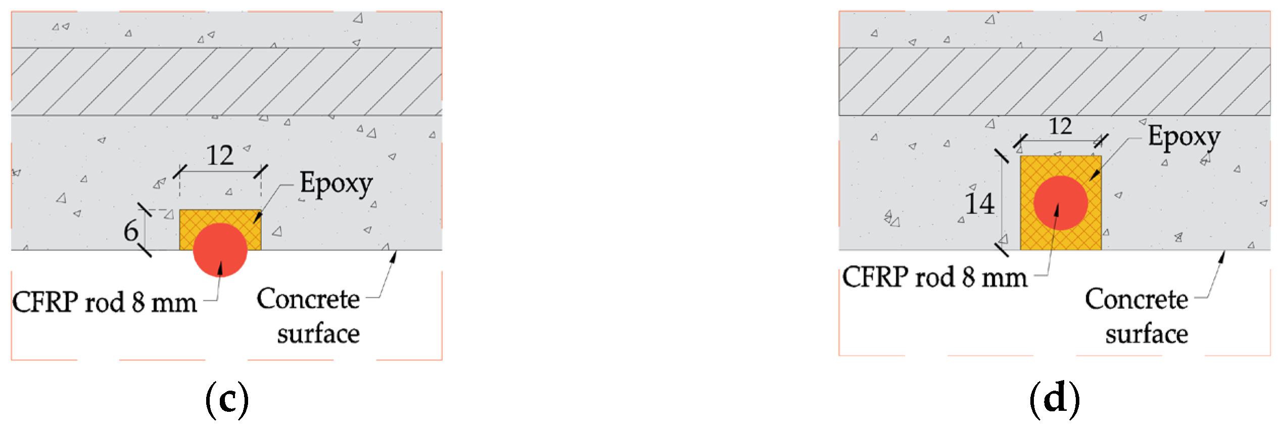 - Han, A.L.; Hu, H.-T.; Gan, B.S.; Hsiao, F.-P.; Haryanto, Y. Carbon fiber-reinforced polymer rod embedment depth influence on concrete strengthening. Arab. J. Sci. Eng. 2022, 47, 12685–12695. [Google Scholar] [CrossRef]