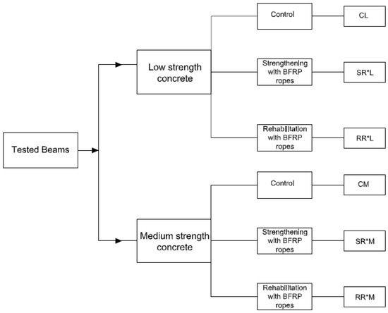 Six beams were subjected to testing, three cast with low-strength and three with medium-strength ready-mixed concrete. The beams were categorized into three groups: Group I consisted of a control beam without any BFRP reinforcement; Group II included three beams that were repaired using NSM-BFRP ropes; and Group III comprised three beams that were strengthened with NSM-BFRP ropes. The grouping is illustrated in Figure 2.