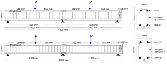 Six large-scale continuous RC beams were cast and tested to the point of failure. The beams were designed according to ACI 318M-11 [37], as depicted in Figure 3. The ratio of tensile steel reinforcement to compression steel reinforcement (ρ/ρ′) was kept constant at 1 throughout the entire length of each beam. To avoid shear failure, closed nominal stirrups with a 10 mm diameter were consistently arranged at 120 mm and 100 mm for low- and medium-strength, respectively, calculated using the actual concrete compressive strengths (f′c = 20 MPa and 32 MPa) and rebar yield strengths (fy = 420 MPa).