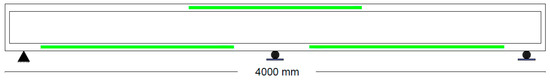 Figure 4 shows the configuration used for strengthening and repairing of the beams. In this experimental setup, BFRP ropes were embedded in regions subjected to positive and negative bending moments, with reinforcement continued past the expected points of contraflexure (zero moment) to ensure continuity, as shown in Figure 5. This arrangement was designed to ensure continuous reinforcement across critical zones, enhancing structural performance under flexural demands.