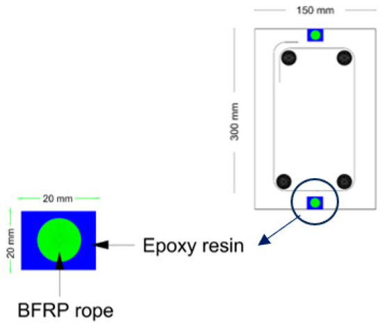 Before attaching the BFRP ropes to the beams, the surfaces must be cleaned thoroughly to remove dust or loose materials. A groove with dimensions of 20 mm width by 20 mm thickness was drilled into the beams using an electric saw machine for the BFRP ropes as shown in Figure 6. The groove was then partially filled with epoxy resin as per the manufacturer’s instructions. Then, the BFRP rope was installed in the grove and covered with epoxy. For strengthening, the BFRP ropes were directly placed into the beam’s grooves. Prior to rehabilitation, the beams were pre-loaded to 70% of the ultimate load capacity (the maximum load the beam can carry before failure, corresponding to the point at which significant flexural cracks develop, and the beam can no longer sustain additional loading, the ultimate load of each RC beam was determined experimentally by applying a monotonically increasing load until failure. The load was applied in increments of 10 kN/s, and the beam response was continuously monitored until a sudden drop in load-carrying capacity indicated ultimate failure.) of the control beam before the BFRP ropes were installed. The rehabilitated beams were then reloaded to failure under the same conditions. Specialized machinery was employed to smooth the surface following the application of basalt fiber. The beams were left for one week to facilitate the curing and enhancement of the epoxy after the installation of BFRP ropes. The BFRP ropes were applied both at the top and bottom of the beams to strengthen and rehabilitate them, taking into account the positive and negative moments experienced during flexural loading.