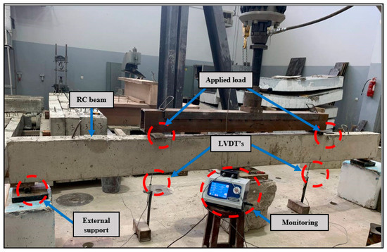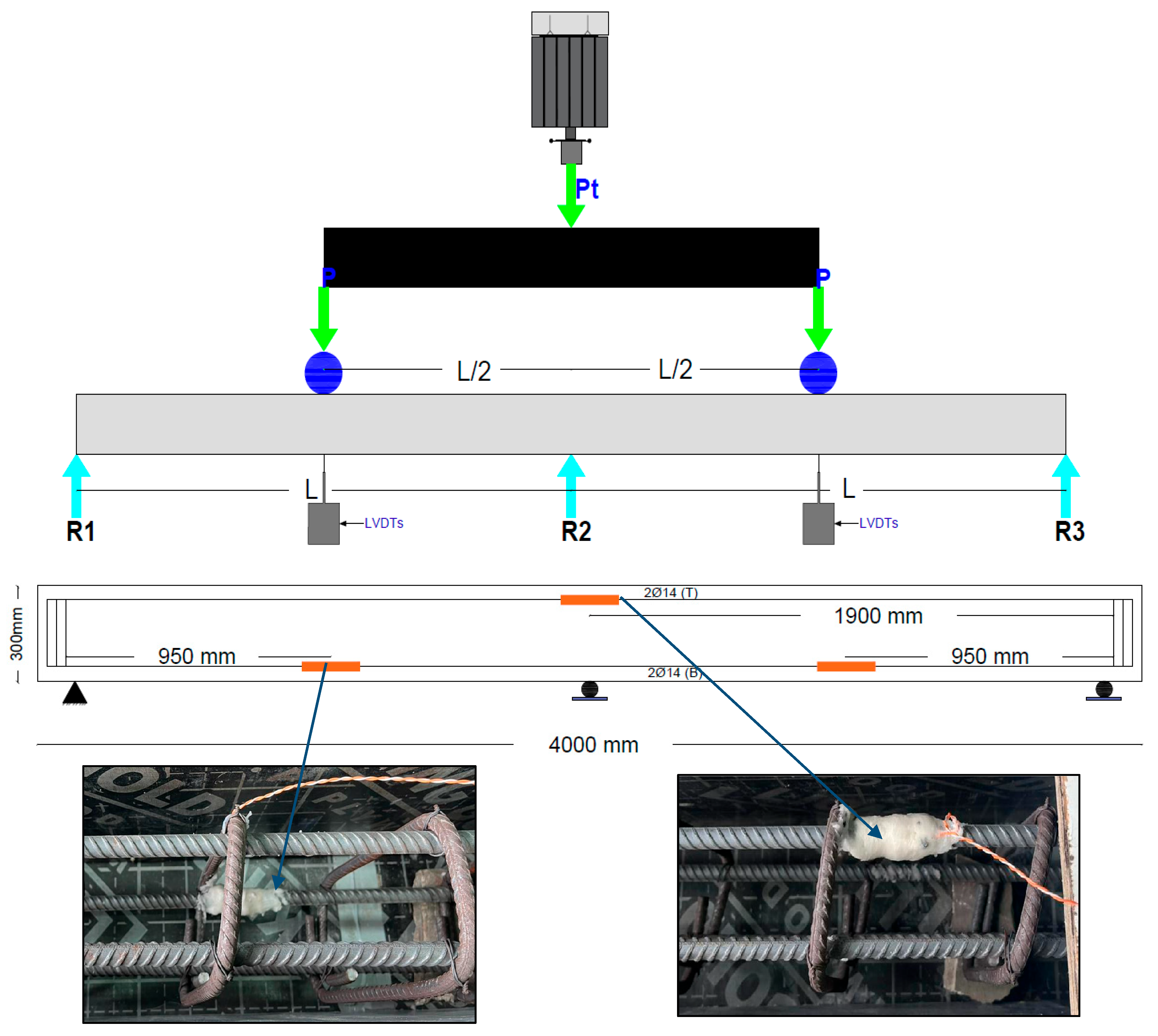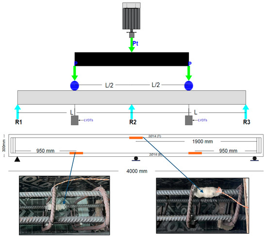 The load was applied to the beams using a hydraulic jack at a rate of 10 kN per second. Two vertical linear variable differential transducers (LVDTs) were utilized to measure the vertical deflection at the mid-span of each beam. Internal electrical strain gauges were installed on the reinforcement bars to measure strains at different locations, such as mid-span and central support of the beams. Figure 8 depicts the positions of the strain gauges. To ensure precise measurement, all strain gauges were coated with polyurethane material to provide protection against moisture and dust. While this does not make the gauges perfectly waterproof, it provides sufficient protection for the duration of the experimental tests under normal laboratory conditions. During testing, each beam was loaded until the load-deflection curve reached its peak, ensuring that the complete load-carrying capacity of the beam was reached. At this stage, the beams exhibited visible cracking patterns and large mid-span deflections, confirming ultimate failure.