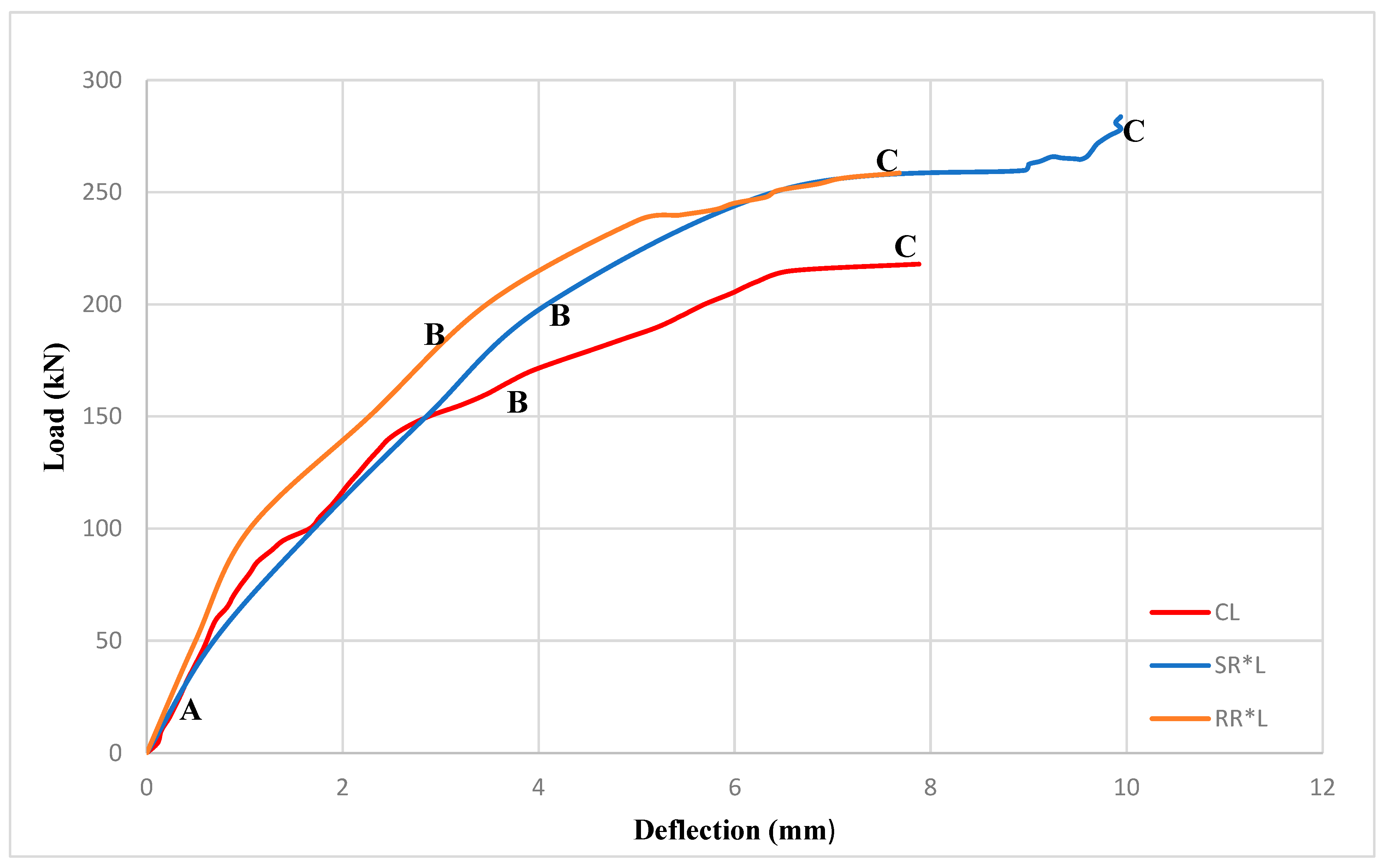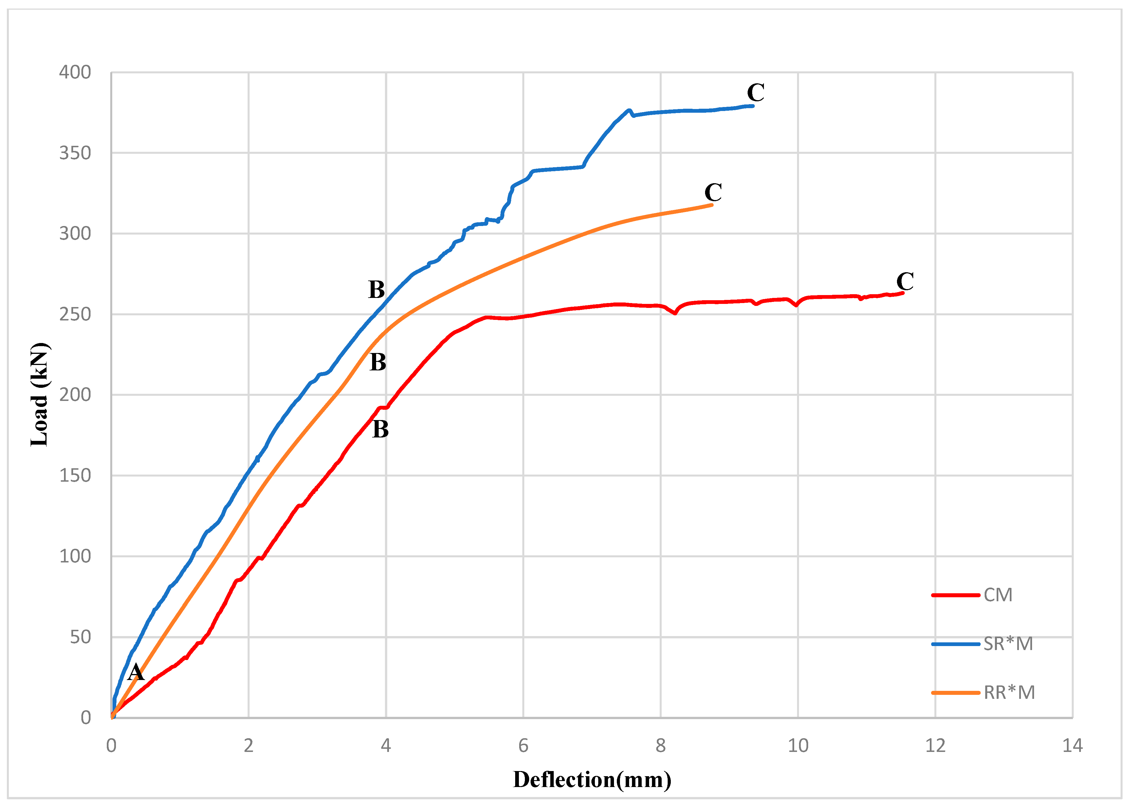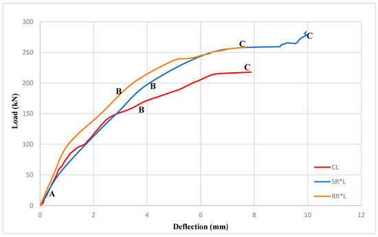 Figure 9 and Figure 10 show the loads versus mid-span deflection, measured using LVDTs, for beams CL, SRL, RRL, CM, SRM, and RRM. Key stages denoted as points A, B, and C mark significant milestones such as crack initiation, steel yielding, and maximum capacity of the beams. These phases were determined by observing variations in the gradient of the curves. In general, the NSM-BFRP beams showed increased yielding and ultimate loads, relative to the control beam, and the cracking load stayed stable.