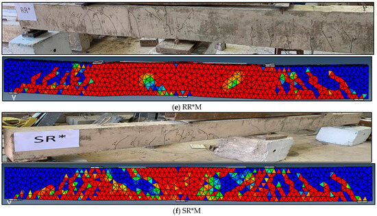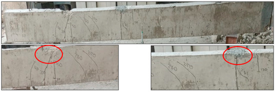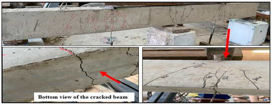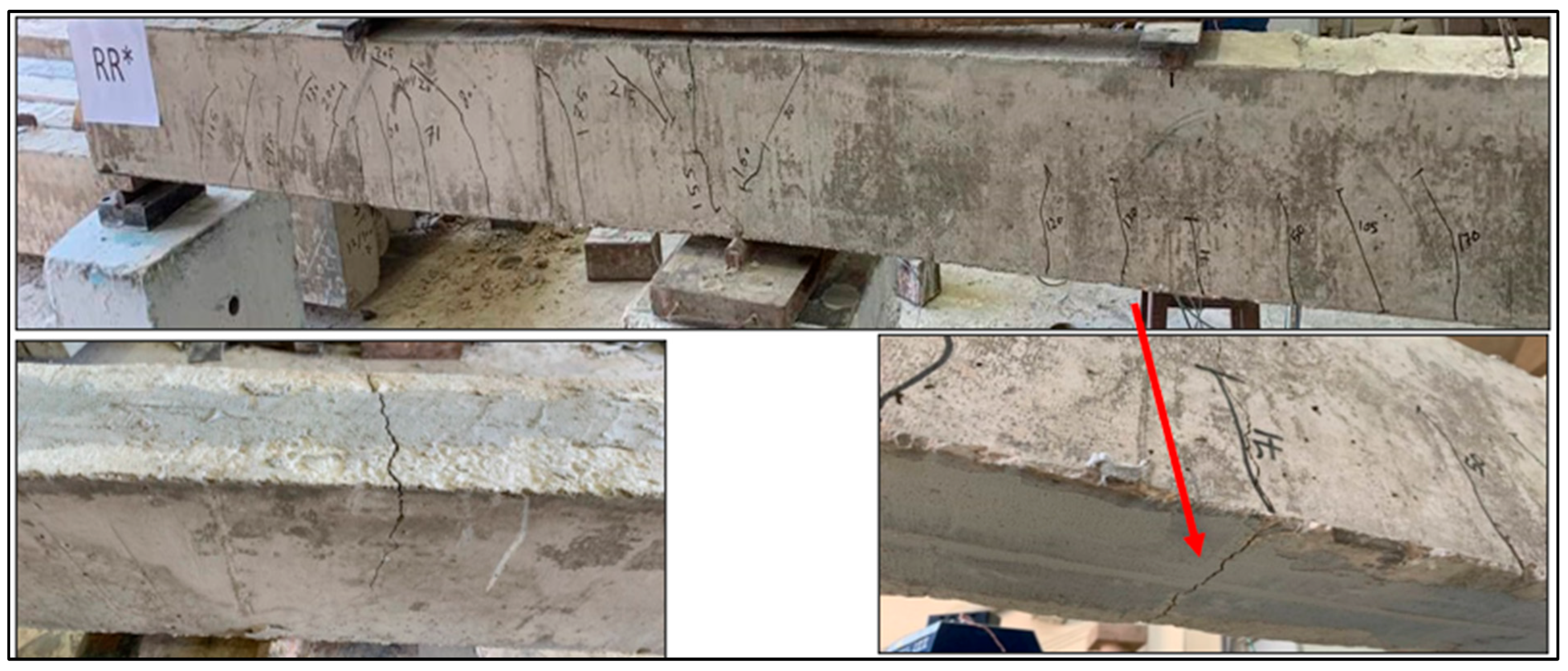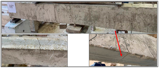 The RR*M beam, initially subjected to a load equivalent to 70% of its ultimate capacity, underwent rehabilitation through the application of NSM-BFRP ropes. This intervention resulted in a notable increase in flexural strength, approximately 20.7% higher than that of the control beam. The beam’s ultimate failure load was recorded at 317.8 kN, accompanied by an ultimate deflection at the midspan measuring 8.74 mm, as detailed in Table 3. The adoption of BFRP ropes as a rehabilitation material for medium-strength concrete in flexural applications demonstrated positive outcomes in terms of rehabilitation effectiveness. It is noteworthy that the failure mode observed was flexural, characterized by the formation of flexural cracks at both the mid-support and midspan. Notably, there was no occurrence of debonding or separation of the BFRP ropes from the concrete cover, as depicted in Figure 16. The failure remained flexural, with cracks forming at both mid-support and mid-span, and no debonding or cover separation confirming the efficiency of NSM-BFRP ropes in rehabilitating preloaded beams.