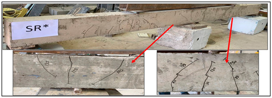 The SR*M beam underwent strengthening with NSM-BFRP, resulting in a significant 44% increase in its load-carrying capacity compared to the control beam. Throughout testing, the beam displayed a purely ductile failure, with flexural cracks emerging at both the midspan and the middle support, yet no debonding or separation of the concrete cover occurred. This underscores the successful implementation of NSM-BFRP ropes, which enhances both the structural strength and ductility of the RC beam while maintaining robust bonding between the BFRP ropes and the concrete surface. The continuous reinforcement along the beam’s span ensures uniform distribution of strengthening effects, mitigating the risk of localized stress accumulation that could lead to debonding or cover separation, as depicted in Figure 15. The failure load rose to 379 kN, accompanied by a maximum deflection of 9.34 mm at midspan, as shown in Table 3. The enhanced behavior is attributed to multiple mechanisms: the BFRP ropes act as supplementary tensile reinforcement, improving stress redistribution along the span; the confinement effect delays crack propagation and concrete crushing; and the continuous rope placement ensures uniform strengthening, preventing localized overstress.