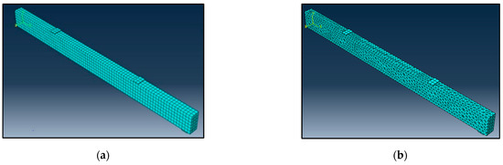 The stress–strain relationships of the steel reinforcement were modeled using a linear elastic-perfectly plastic approach. The BFRP ropes were represented as linearly elastic until failure, presuming a perfect bond between the BFRP ropes and the concrete surface via a tie connection. The characteristics of the BFRP ropes and steel reinforcement are detailed in Table 6.
