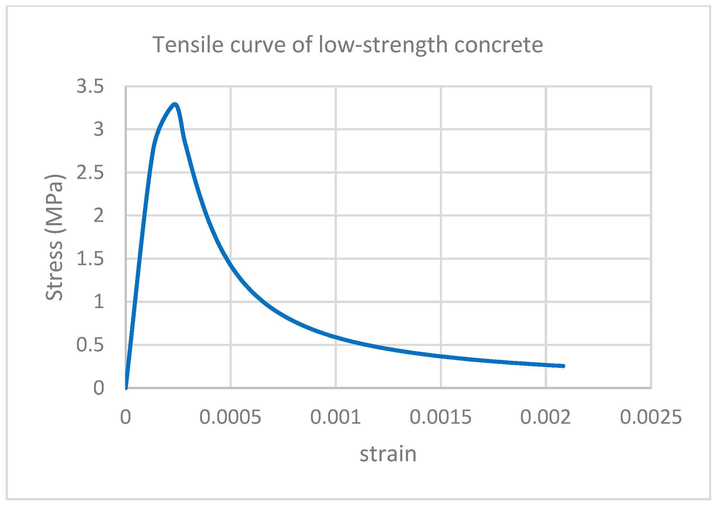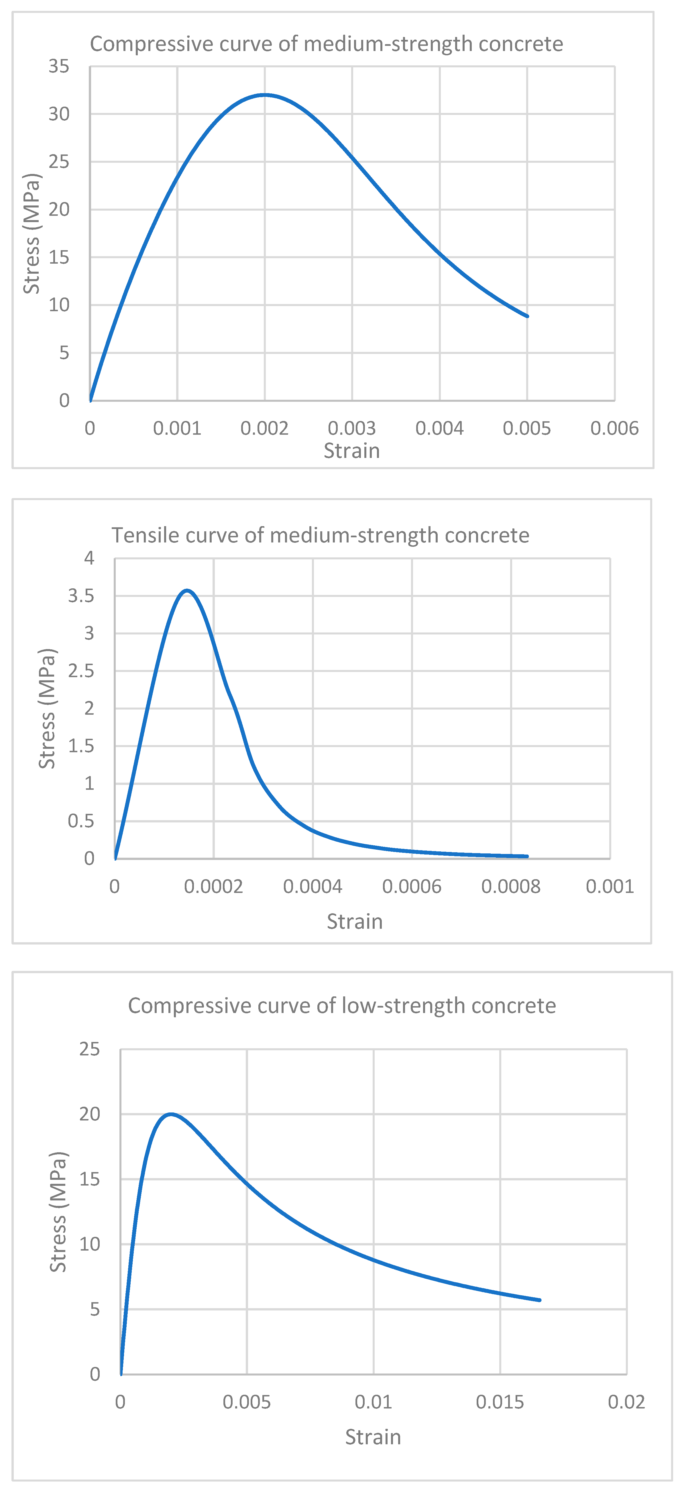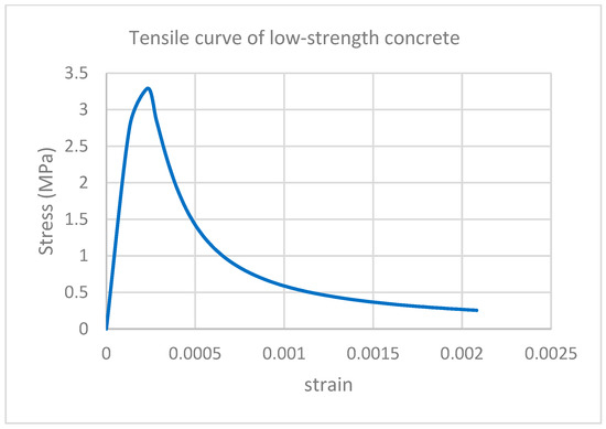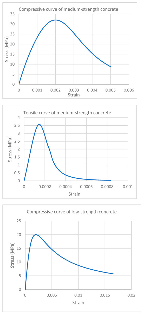 To capture the nonlinear behavior of concrete in RC beams, Tsai’s constitutive model was employed for low and medium-strength RC beams, which allows for realistic simulation of both tensile and compressive responses, including post-peak softening. The model incorporates strain-softening characteristics beyond peak stress, which are essential for representing the gradual loss of strength in the compression zone due to crushing, as well as cracking and tension stiffening effects in the tensile region. The stress–strain relationships used in this study were calibrated for medium and low-strength concrete, and the corresponding curves are shown in Figure 20. These relations were critical for simulating the progressive failure mechanisms in RC beams and ensuring reliable prediction of their structural performance under loading.
