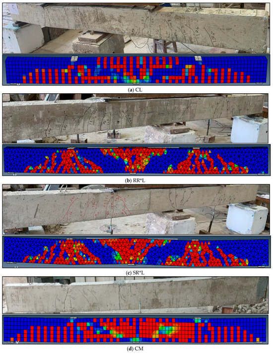 The developed finite element (FE) models were validated using the experimental load–displacement curves and observed crack patterns of the test specimens. Figure 21 shows the numerical and experimental results, while Figure 22 compares the crack patterns. These comparisons indicate a close similarity between the experimental and numerical behaviors of the test specimens. The higher stiffness observed in Figure 21 in the elastic phase of the FE curves compared to the experimental results is primarily due to the idealized material properties and boundary conditions in the FE model. In numerical simulations, concrete is typically assumed to be homogeneous and free from microcracks, whereas real concrete structures contain imperfections, shrinkage effects, and initial microcracks that reduce stiffness. Additionally, the perfect bond assumption between reinforcement and concrete in FE models neglects bond-slip effects, leading to an overestimation of stiffness. Experimental tests also involve instrumentation and support flexibility, which can introduce minor deformations not accounted for in the FE model, further contributing to the observed discrepancy. To evaluate the influence of mesh density on the load–carrying behavior of the beams, a mesh sensitivity analysis was performed. The concrete element size was progressively refined, and the corresponding load–deflection responses and ultimate capacities were compared. The results indicated that further refinement beyond the chosen mesh size produced negligible changes in the predicted ultimate load and failure mode, while substantially increasing computational cost. Therefore, the adopted element size was selected as an optimal balance, ensuring both computational efficiency and accuracy. The selected mesh provided numerical results that agreed well with the experimental load–carrying capacities of the beams. In Figure 22, the tensile stresses in the concrete are depicted using a color gradient: red signifies the highest tensile stresses, yellow indicates lower stresses, and blue represents the lowest tensile stresses. The crack patterns for all test specimens are shown in red. The crack patterns of the beams are positioned below the tensile stress figures. Both negative and positive moment flexural cracks were observed in both the numerical and experimental behaviors of the test specimens, consistent with expectations. It was observed that the cracked regions around the supporting and loading points of the strengthened and rehabilitated beams were more developed than those in the control specimens. This behavior can be explained by the increased load-carrying capacity provided by the BFRP ropes, which allowed the beams to sustain higher loads and consequently caused larger stresses to be concentrated in these critical regions. The redistribution of internal forces in the continuous beams also contributed to the expansion of cracks near the supports and loading points. The presence of BFRP ropes delayed premature failure and enabled the formation of additional flexural cracks, thereby enhancing the ductility and energy absorption capacity of the strengthened and rehabilitated beams. In summary, Figure 21 and Figure 22 demonstrate that the developed FE models effectively predicted the observed behavior of the continuous beams.