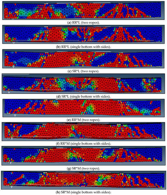 After validation between experimental and FEM results, the work was extended by employing new FEM models, cross-verified against experimental outcomes for congruence. Introducing a configuration featuring two BFRP ropes served as a viable alternative to the use of a single BFRP rope, ensuring identical lengths and placements. Furthermore, supplementary BFRP ropes were incorporated alongside the beam, aligning parallel to the steel reinforcement, complemented by single BFRP ropes situated at the beam’s upper and lower extremities, as depicted in Figure 23a,b. This approach holds promise for advancing predictive capabilities in future applications. Table 7 presents the outcomes of the extended models using FEM, depicting new rehabilitation and strengthening patterns for two-span RC beams. The increase in flexural strength percentage highlights the efficiency of these patterns in comparison to the experimental single rope configuration. Figure 24 shows the crack patterns for the expanded models.