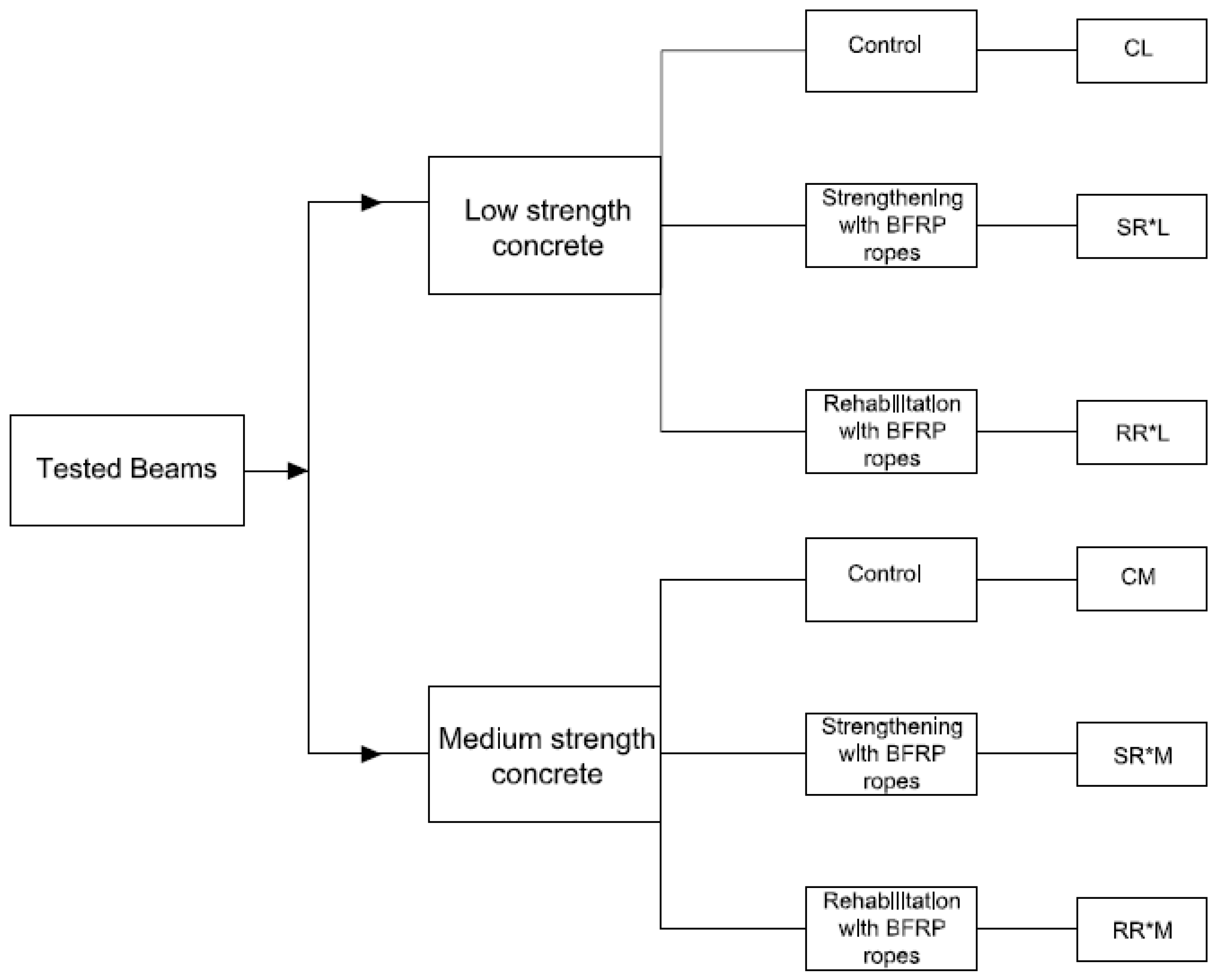 A comparison between low and medium-strength concrete beams reveals that the cracking load varies depending on concrete strength, with higher-strength concrete generally exhibiting delayed crack initiation due to its improved tensile resistance. Furthermore, the effectiveness of the strengthening and rehabilitation method becomes evident in the post-cracking phase, where the addition of BFRP ropes plays a crucial role in controlling strain development and delaying steel yielding.