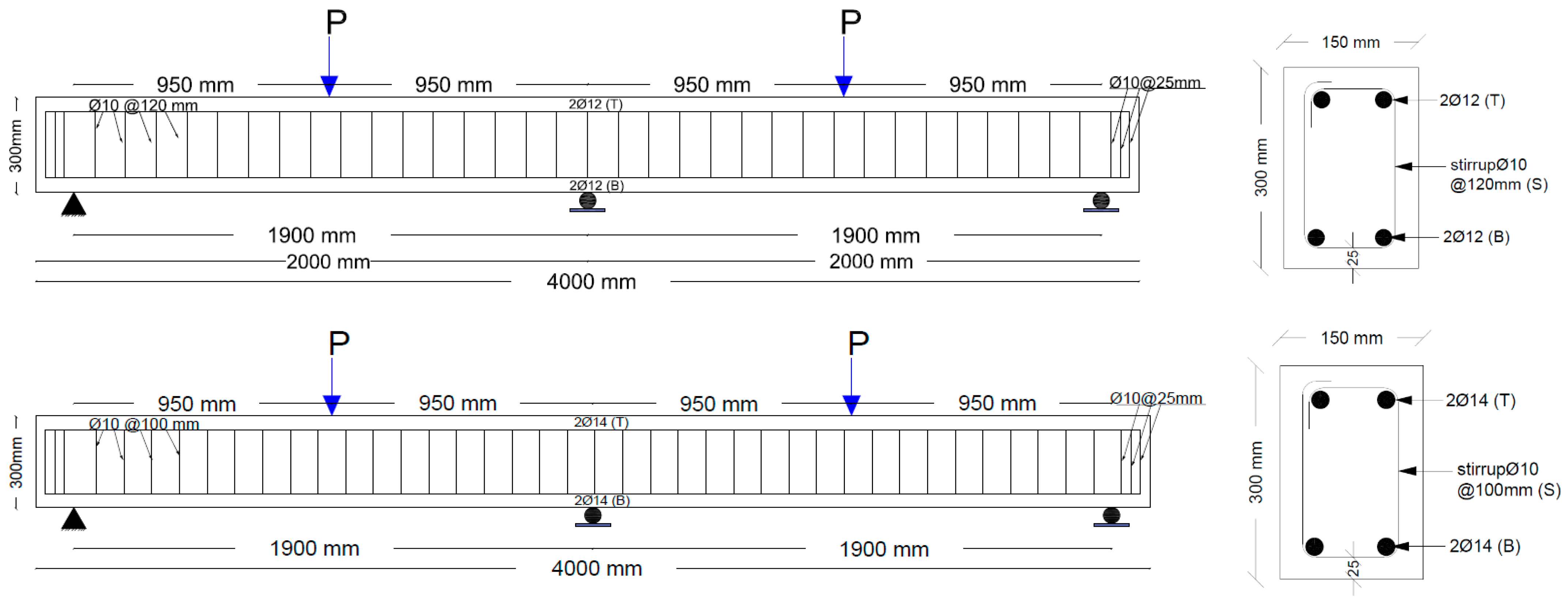 Figure 7 shows the test setup detail; each beam was tested under two-point loads. The experiment recorded the total applied load (Pt = 2P), mid-span deflection (δ), and steel strain (εs) throughout the loading process.