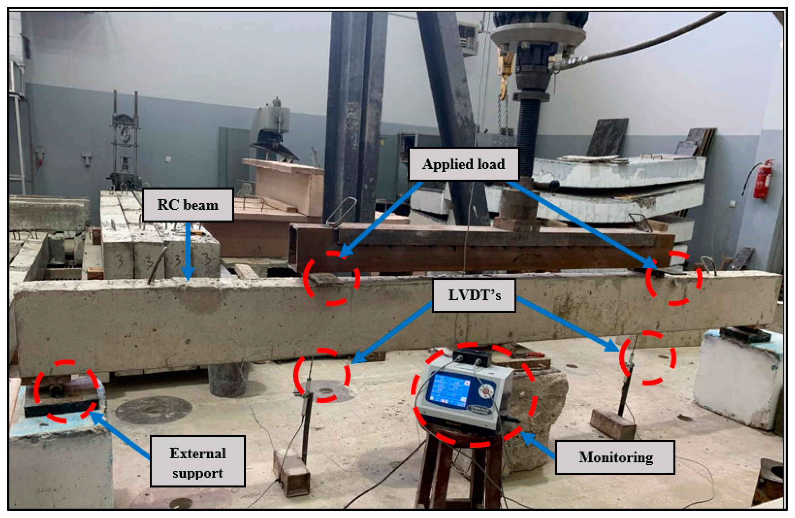Normal-, medium-, and low-strength concrete was used to cast all beam samples [35]. Further details about the mixes are outlined in Table 1 as provided by the manufacturer. Compressive strength tests conducted at 28 days on three cylinders per mix resulted in average values of 20.23 MPa and 32.2 MPa. Beam specimens were reinforced with deformed high-yield steel bars complying with ASTM A615M [36], using 12 mm and 14 mm diameters. The 12 mm bars had an average yield strength of 500 MPa and an ultimate tensile strength of 703 MPa, while the 14 mm bars showed values of 535 MPa and 755 MPa, respectively.