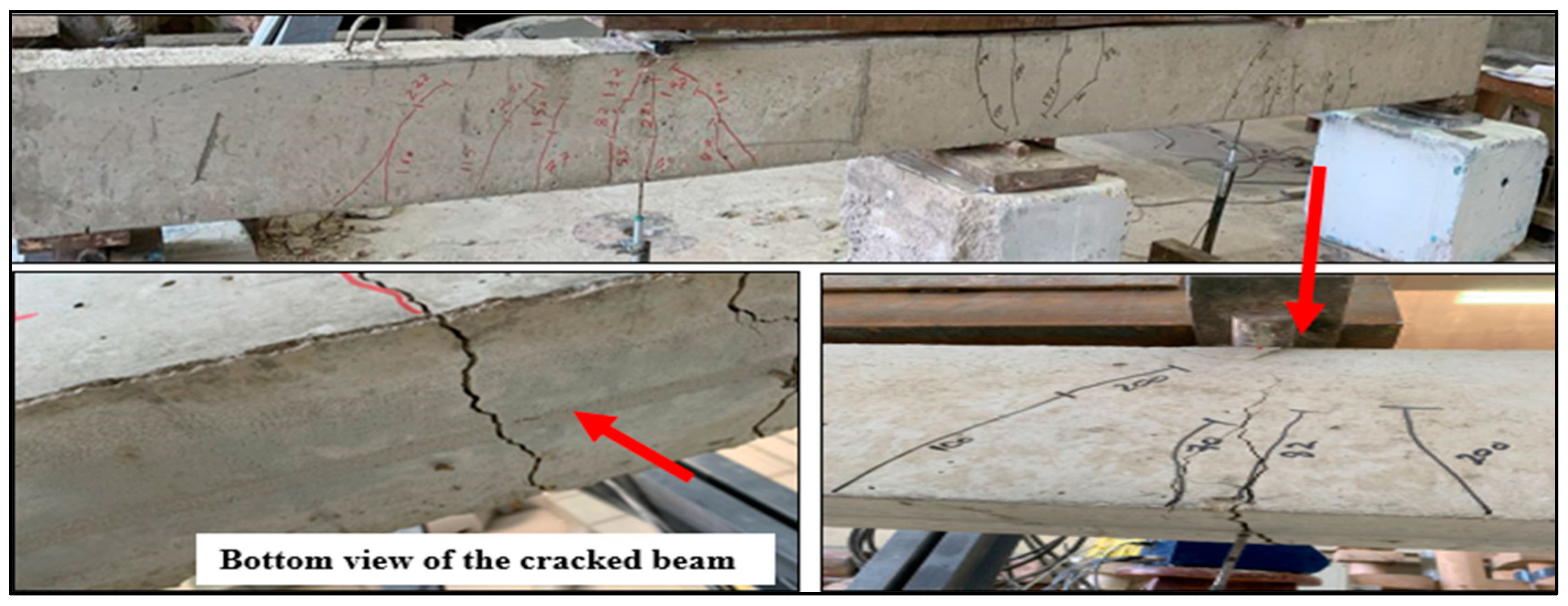 In this study, beams designated for rehabilitation were subjected to preloading up to 70% of their ultimate load capacity before strengthening. This loading level was chosen to replicate realistic service conditions where RC members experience significant cracking and stiffness degradation before intervention. The selected preloading ratio is consistent with prior research [38,39], which suggested that preloading in the range of 60–75% offers a practical balance between inducing representative damage while preserving the structural integrity required for successful strengthening.