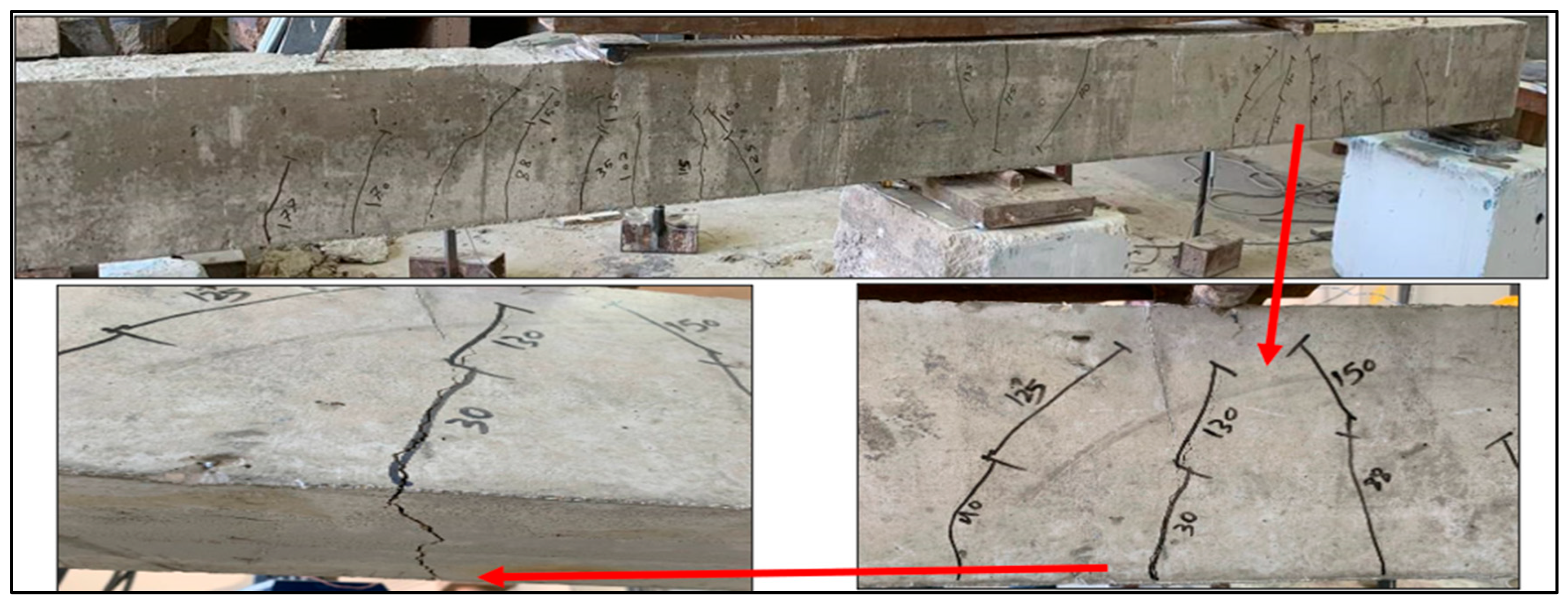 In this part, the peak load values and maximum deflections at the mid-span of the tested beams were assessed. At the central support, the yielding in the tensile steel reinforcement was precisely captured through strain gauge measurements.