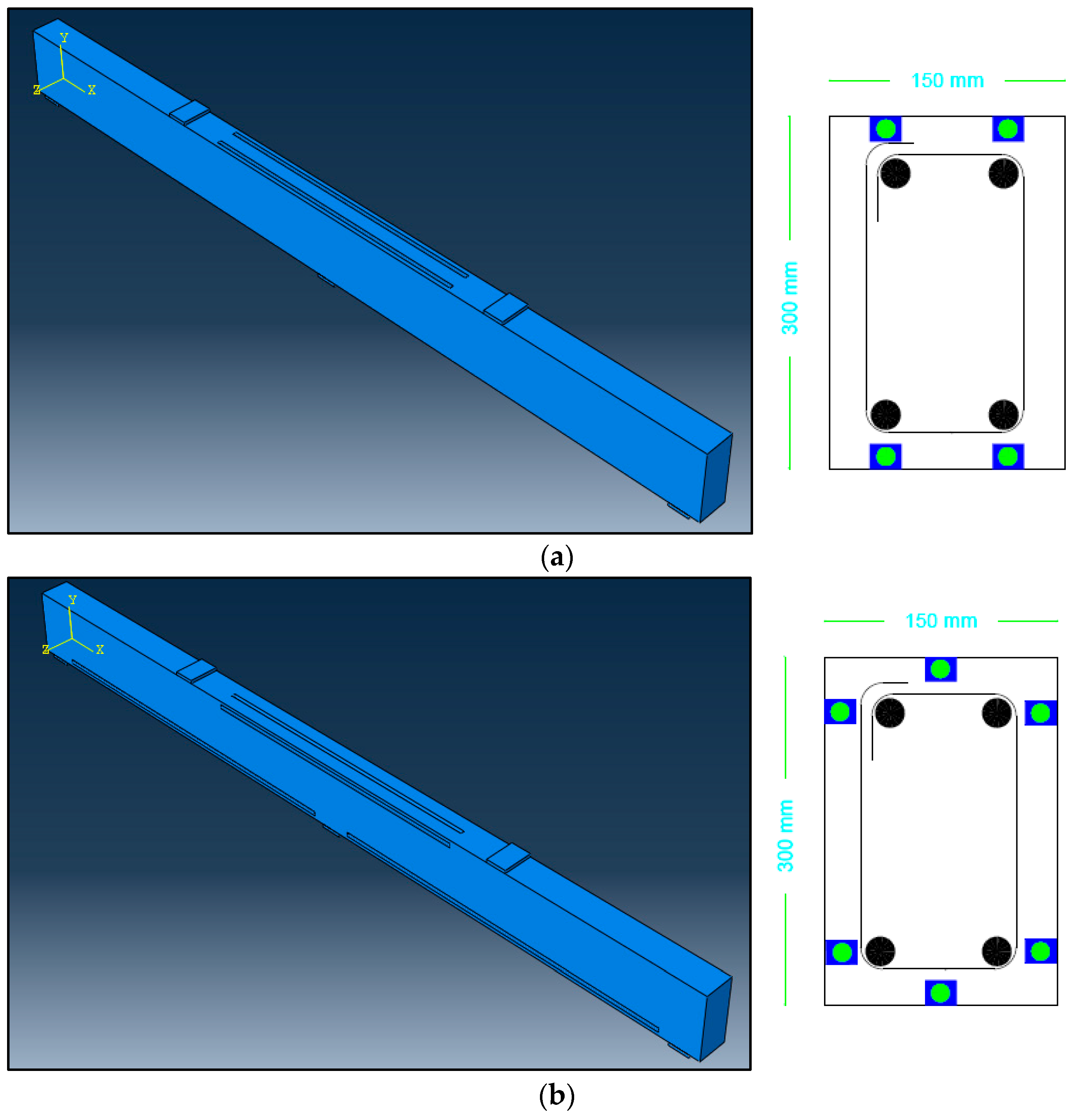 The compressive strength for low-strength concrete was determined to be 20 MPa, while for medium-strength concrete, it was 32 MPa. The modulus of elasticity for the low-strength concrete was 19,378.6 MPa, and for the medium-strength concrete, it was 26,587.2 MPa. Additionally, Poisson’s ratio for both concrete types was 0.2.