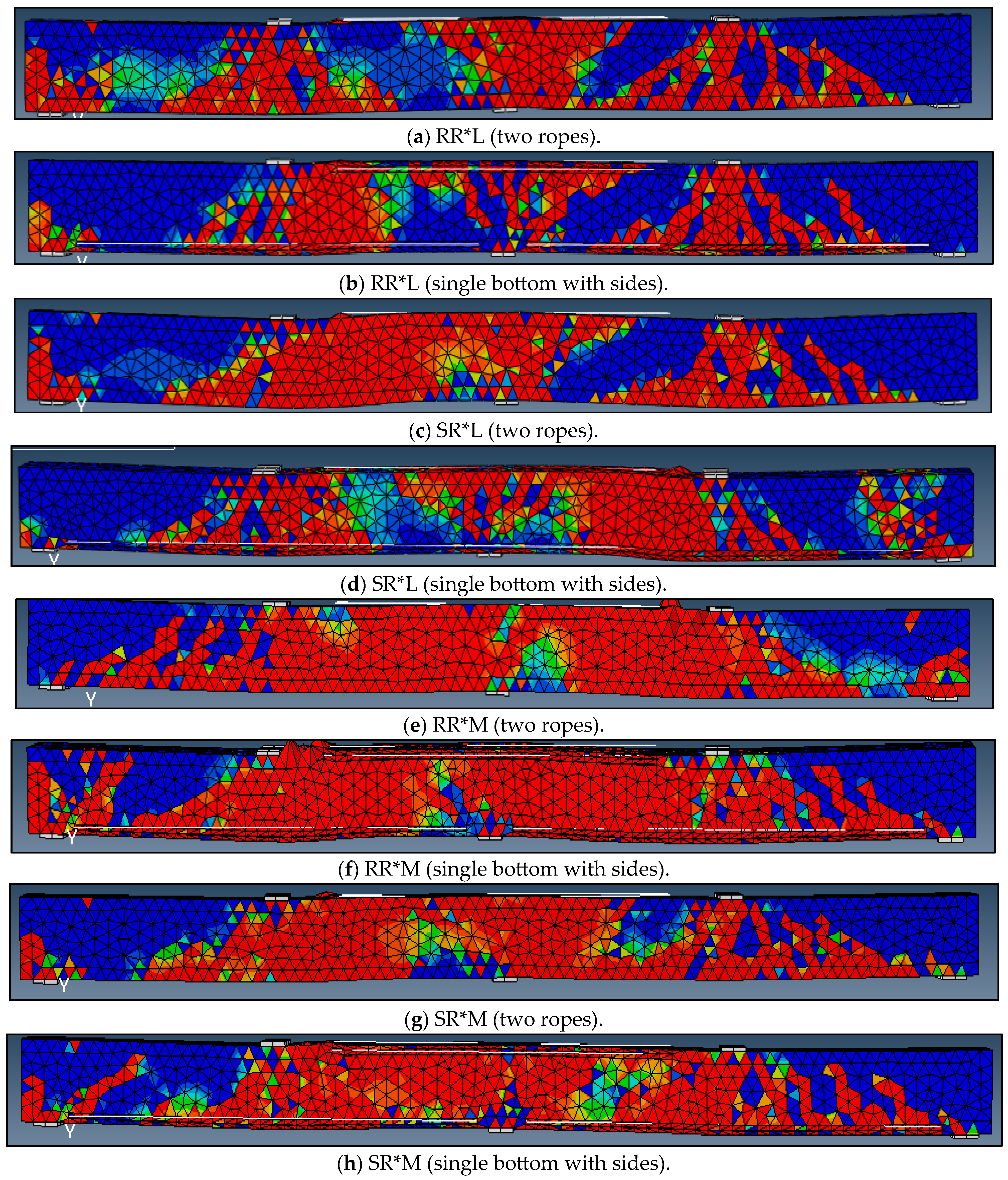 - The configurations involving two BFRP ropes at the bottom or single-sided ropes with a bottom rope were particularly effective, achieving load enhancements of 31% to 65% and 21% to 58%, respectively, demonstrating the importance of strengthening pattern optimization.