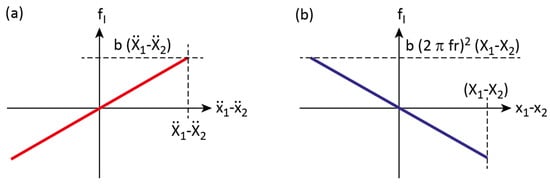 where is the frequency of vibration, which is equal to the excitation frequency. The term guarantees that the inerter force that is computed based on the relative displacement (8) has the same force amplitude as the inerter force that is computed based on the relative acceleration (3), and the minus sign guarantees that the inerter force (8) is in phase with the inerter force (3). So, the formulation (8) of the inerter force as a function of the relative displacement of its terminals generates the same force as the original inerter Equation (3).