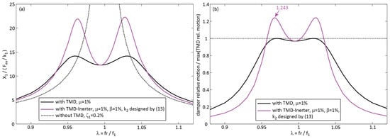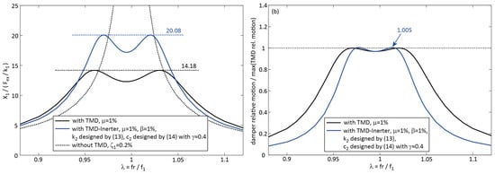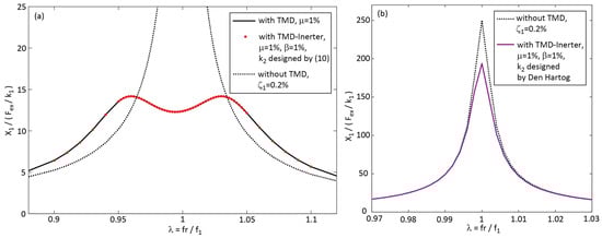 (a) Normalized primary structure displacement amplitude due to the TMD-Inerter with stiffness design according to (10) and due to the classical TMD; (b) normalized primary structure displacement amplitudes of the structure without supplemental damping and with the TMD-Inerter with stiffness according to Den Hartog’s design.