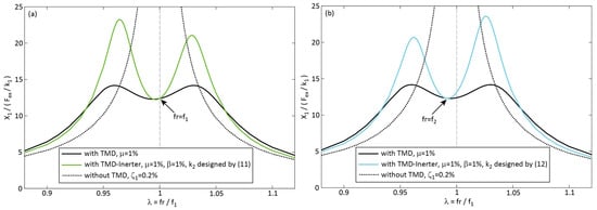 The normalized structural displacement amplitudes resulting from the two tunings (11) and (12) are depicted in Figure 4a,b. The green line is obtained from the stiffness design (11), which fully compensates for the inerter negative stiffness at the vibration frequency , while the stiffness design (12) achieves the full compensation at (cyan line). At all other frequencies of vibration, both stiffness designs (11) and (12) do not fully compensate for the frequency-dependent inerter negative stiffness, which is the only reason for the significantly higher displacement responses in these regions. Although these higher peaks look similar to those of an underdamped TMD-Inerter, it is underlined that these higher peaks to the left and right of and , respectively, are only caused by the fact that the inerter negative stiffness compensation terms of (11) and (12) are formulated based on the constant frequencies and , respectively, to be able to realize by a passive spring. Therefore, the passive spring stiffness designs (11) and (12) fully compensate for the inerter negative stiffness only at and , respectively, while at all other frequencies of vibration the inerter negative stiffness is not fully compensated by (11) and (12).