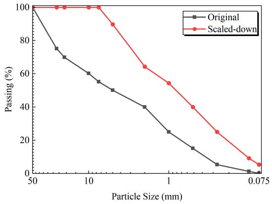 Due to the presence of coarse particles, the maximum particle size for triaxial specimens was limited to 1/5 of the specimen diameter in accordance with the provisions of China’s Standard for geotechnical testing method (GB/T 50123-2019) []. With a specimen diameter of 39.1 mm and a height of 80 mm, the maximum particle size in this test was 7.82 mm. Therefore, the maximum particle size of the crushed stone was reduced accordingly. The particle size distributions of the original soil sample and the scaled specimen are shown in Figure 1. The soil–rock threshold was calculated using Equation (1) []: