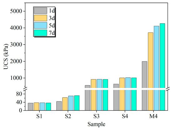 Unconfined compressive strength tests were performed on specimens from all treatment groups, and the results are presented in Figure 3. The untreated soil (Group S1) exhibited a negligible UCS that remained relatively constant throughout the curing period, which can be attributed to its high initial moisture content. In contrast, all treated groups showed varying degrees of strength enhancement compared to the S1 baseline. Among the control groups, the EICP-stabilized specimens (Group S2) demonstrated the most modest strength gain. The most significant improvement was observed in the EIMC-treated specimen with 8% MgO (Group M4), which achieved a UCS approximately 113 times greater than that of the untreated soil.
