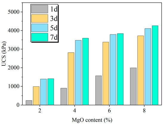 As illustrated in Figure 4, the UCS of the specimens demonstrated a clear positive correlation with the MgO content. This trend is attributed to a higher MgO content providing more reactant for the EIMC process, which leads to a greater yield of both magnesium hydroxide and the crucial hydrated magnesium carbonate binders. The resulting increase in cementitious products leads to a denser soil matrix and, consequently, improved mechanical performance.