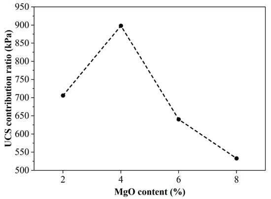To evaluate the efficiency of the stabilization, a “UCS contribution ratio” was defined as the UCS gain per unit of active MgO content. This metric quantifies the binder’s efficiency, with a higher ratio indicating a more effective use of the material. The relationship between this ratio and the MgO dosage is presented in Figure 5. The UCS contribution ratio was observed to increase with MgO content up to 4%, after which it declined. The peak at 4% signifies that this dosage provides the maximum strength gain per unit of MgO. This finding suggests a point of diminishing returns for dosages above 4%.