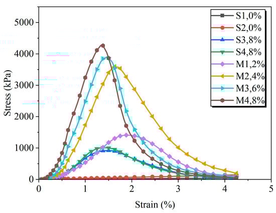 The stress–strain behavior of the gravelly soil under various treatment conditions was evaluated through unconfined compression tests, with the results depicted in Figure 6. The untreated soil (S1) displayed ductile, plastic failure without a distinct stress peak. In contrast, all stabilized groups exhibited brittle failure, characterized by a well-defined peak strength followed by a sharp post-peak stress drop. This transition is attributed to the formation of cementitious binders, which increased the soil’s cohesion.