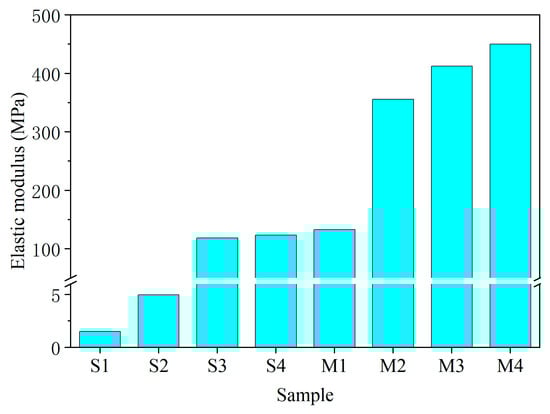 The elastic modulus reflects a material’s resistance to elastic deformation. In this study, it was calculated as the tangent modulus from the initial linear portion of the stress–strain curve. The results for all groups are presented in Figure 8.