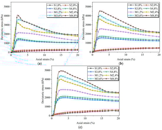 Stress–strain relationship curves of samples after 7 days of curing under different confining pressures: (a) σ3 = 100 kPa; (b) σ3 = 200 kPa; (c) σ3 = 200 kPa.