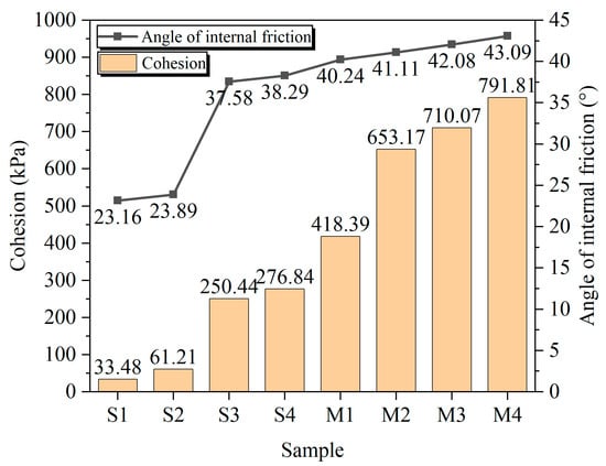The peak shear strength of each specimen was determined from the stress–strain curves presented in Figure 10. For materials exhibiting strain-softening, the strength was defined as the peak deviatoric stress. For those displaying strain-hardening behavior, it was taken as the deviatoric stress at 15% axial strain, a common convention for soils lacking a distinct failure peak. All stabilization methods enhanced shear strength relative to the untreated soil (S1), with the EIMC technique proving most effective. For instance, the strength of Group M4 far exceeded that of the EICP (S2) or MgO-only (S3, S4) treatments. Within the EIMC series (M1–M4), shear strength demonstrated a direct positive correlation with MgO content. This is attributed to the greater production of cementitious binders at higher dosages, which results in better integrity and mechanical properties.