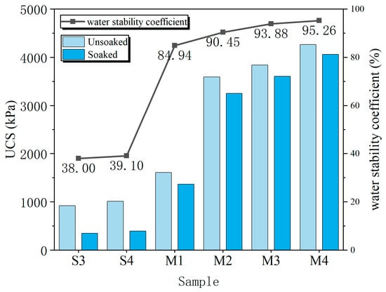 The water stability of the stabilized soil was quantified using a water stability coefficient, defined as the ratio of the UCS of a specimen after 24-h water immersion to that of an unsoaked counterpart. The test results for all groups are presented in Figure 12.