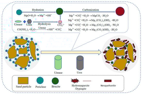 Subsequently, researchers have explored methods to introduce internal carbon sources to enable the self-carbonation of MgO. In a related development, some researchers have recently combined microbially induced calcium carbonate precipitation (MICP) technology with MgO carbonation technology, proposing a microbially assisted MgO carbonation and solidification technology to improve soil properties [,]. Chen et al. [] applied this technology to stabilize electrolytic manganese slag, achieving greater compressive strength and lower heavy-metal leaching. Zhang et al. [] reported its use to improve the resistance to seawater wetting of coastal sand dunes. The underlying mechanism is that microorganisms promote MgO carbonation by producing urease, which hydrolyzes urea to generate carbonate ions. The underlying mechanism is derived from conventional MICP technology []. In MICP, microorganisms produce urease, which hydrolyzes urea to generate carbonate ions that typically react with a calcium source to form calcium carbonate. In a similar manner, this enzymatic production of carbonate ions can be harnessed to supply the carbonate required for MgO carbonation. Moreover, utilizing microorganisms to provide carbonate ions avoids secondary pollution, making it a more environmentally friendly approach.