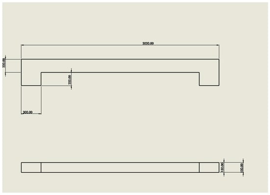 The bench has overall dimensions of 3000 mm in length, 150 mm in width, and 400 mm in height, as shown in Figure 2 and Figure 3. The material used in this model was C20/25 concrete, and the mechanical properties of the material are listed in Table 1. The material properties for C20/25 concrete were taken from 2021 ANSYS Granta Material Data for Simulation [21].