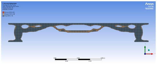 Before conducting the final stress analysis, the optimized density field obtained from the topology optimization was not used directly in the finite element simulation. The optimization output is a voxel-based density layout, which does not form a clean or manufacturable solid body. Therefore, the optimized geometry was remodeled to create a smooth solid representation that preserves the primary load paths identified during optimization. It is important to note that this remodeling process can slightly alter the local stiffness distribution, and therefore the stresses in the remodeled model are generally higher than those reported in the raw topology optimization stage. For this reason, a 10 MPa stress constraint was intentionally used during optimization—significantly below the material’s compressive strength of 20 MPa—to ensure that once the geometry was remodeled and remeshed, the final stresses would remain within safe limits.