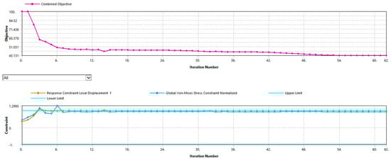 The resulting material distribution and optimized geometry are illustrated in Figure 6 and Figure 7. A comparison between the original and optimized designs in terms of mass and volume is presented in Table 2. The topology optimization converged after 62 iterations, as shown in Figure 8. The solution satisfied all imposed constraints on displacement, stress, and minimum feature size. The final optimized design resulted in a bench mass of 139.36 kg, reduced from the original 258.3 kg.