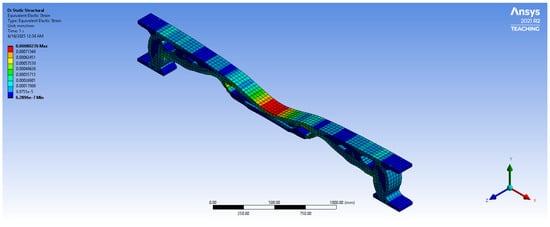 After remodeling, a new finite element analysis was performed. The results showed a maximum compressive stress of 15.5 MPa, which remains below the allowable limit for C20/25 concrete, and a maximum vertical deflection of less than 2 mm, meeting the required criteria. These performance results, including stress, displacement, strain, and strain energy, are summarized in Table 3 (see Figure 9, Figure 10, Figure 11 and Figure 12).