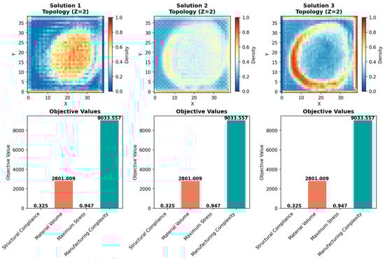 All reported values represent the mean and standard deviation over 50 previously unseen test cases. The benchmarking of the inference was used to evaluate the average prediction time per sample, thereby testing the computational efficiency of the surrogate model. Detailed summaries of the parameter values and measurement definitions are provided in Table 4. Figure 15 provides an evaluation of three topological solutions (Solution 1, Solution 2, and Solution 3) under uniform parameter conditions (Z = 2), highlighting the change in spatial density distributions while showing consistent performance measurements. The top row shows the density heatmaps for each solution showing individual material arrangements: Solution 1 shows a central density core, Solution 2 shows a radially more symmetric distribution, and Solution 3 shows a ring-like arrangement with a priority towards the outer density. The variation between these configurations demonstrates the flexibility of topology optimization in delivering structurally identical but geometrically diverse configurations. The bottom row confirms that all three solutions achieve the same objective values—isotropic structural compliance, metal waste, manufacturing stress, and complexity—demonstrating that several topologies may satisfy the same design requirements. This result has important implications for the addition of aesthetic or manufacturability concerns to the optimization procedure without degrading overall performance.