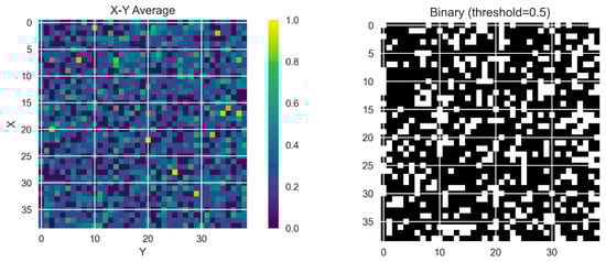 Figure 16 shows the binary conversion of a continuous density field with a threshold value of 0.5. Each matrix cell represents a voxel in the design domain, with white squares indicating the existence of material (density ≥ 0.5) and the absence of black squares (density < 0.5) representing voids. The binary format provides a clear and manufacturable interpretation of the optimized topology, thus allowing the computational output to be transformed into a physical realization. Thresholding plays a critical role in topology optimization techniques since it enables the extraction of the resulting solid geometries suitable for casting/fabrication while retaining the structural intention inherent in the initial density distribution.