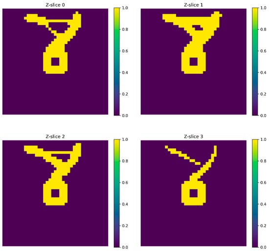 A heatmap representing cross-sectional slices (Z = 0–Z = 3) of a 3D density field is shown in Figure 17, offering insight into the spatial evolution of the material distribution along the depth axis. Each slice was localized at the mid-span of the specimen and reveals distinct patterns of density concentration, with central regions exhibiting higher values (yellow) surrounded by lower-density zones (purple). The gradual shift in shape and intensity across slices suggests a smoothly varying internal topology, indicative of a load-adaptive structure. Such visualization is crucial for validating the continuity and coherence of optimized designs in three dimensions, ensuring that material placement aligns with structural demands throughout the volume. These slices also serve as valuable inputs for postprocessing and manufacturability assessments, particularly in cast-in-place or additive concrete applications.