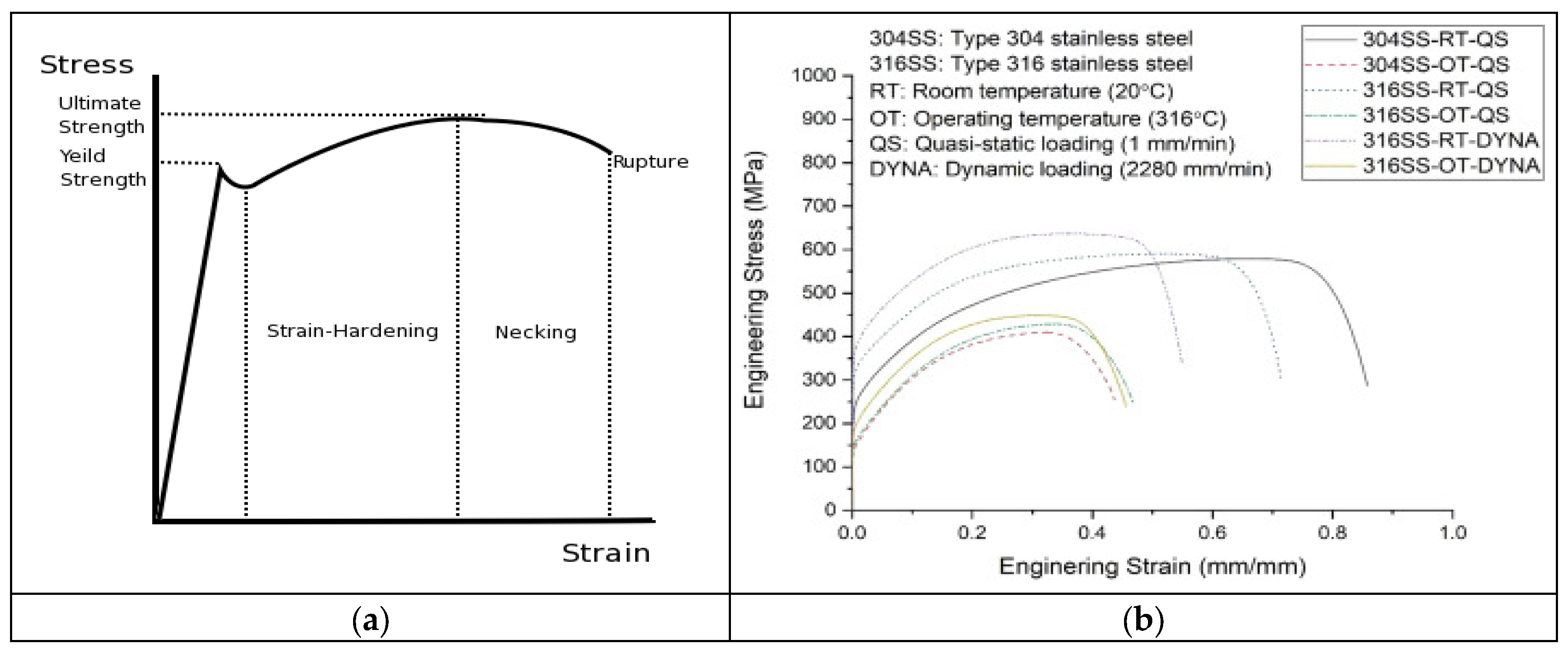 20]), and the stress value increases significantly. This high ductility, high strain value at rupture is particularly useful for our purposes to employ this material in UFPs; as UFPs work to dissipate energy in the plastic region, between the material’s initial yielding and the tensile fracture point. This prolonged resistance to failure allows UFPs to bear high seismic displacement demands and increases the probability of surviving multiple seismic events without replacement and renders SS304 a good candidate to be used as UFPs.