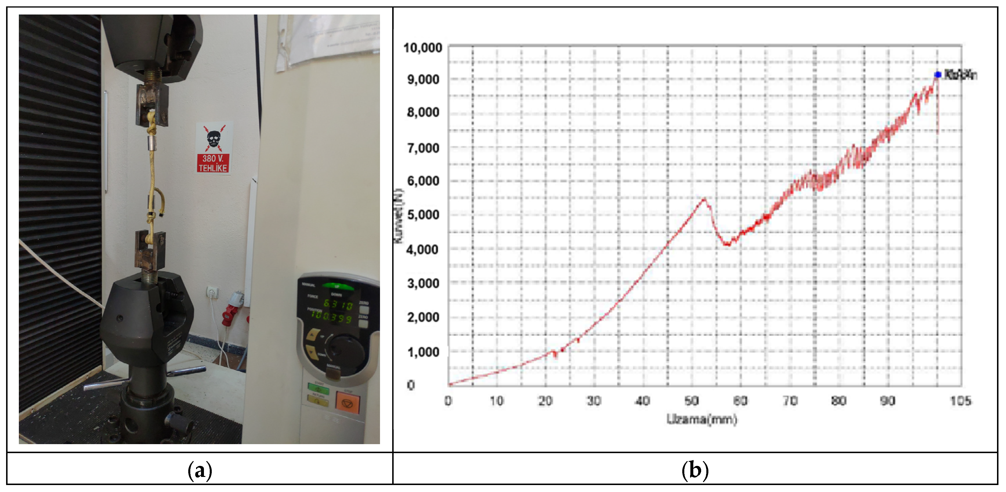 Figure 2b, which shows a drop at 5.5 kN, which denotes premature shearing of some strands in the tendon; this drop renders the usage of the tendon unsafe for tests, due to losses in the tendon’s overall cross section. Moreover, the 5.5 kN force level is low in comparison to the PT forces (12, 25, 35 kN/tendon) that are required during the tests. The plot clearly shows that this configuration is unreliable and cannot be used as a PT tensioning material in our experiments.