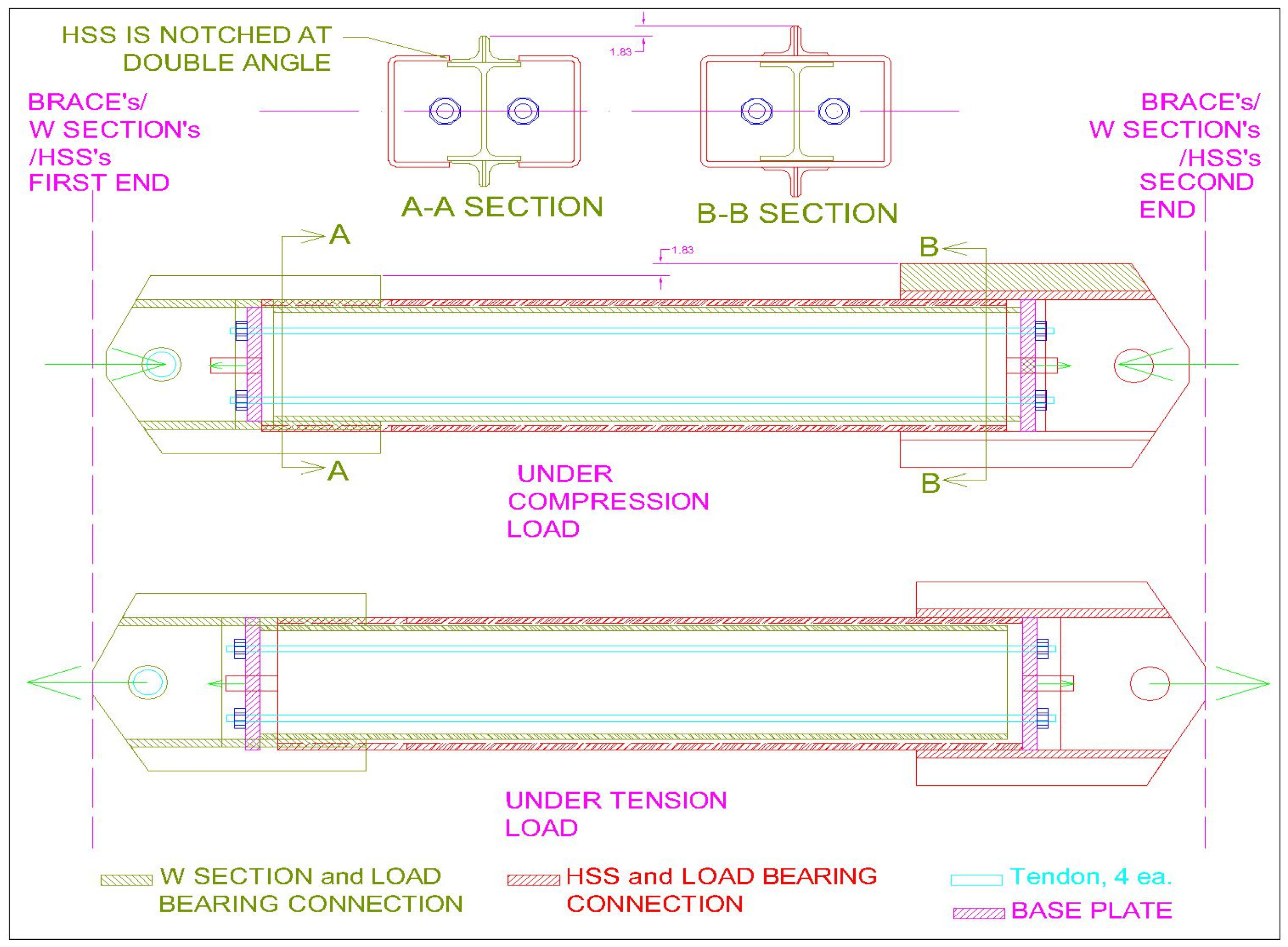 ® tendon configuration, the tendon diameter is derived; they are bound by the two base plates at both ends. Each tendon requires a terminal assembly that connects the tendons to the base plate. The terminals are fabricated from steel plates that have a rod in the middle for tendon connection. The terminal body is welded to 35 mm diameter threaded rods that go through the base plates that are present at both ends of the brace, and tension adjustment is made through the rod and a nut resting on the base plate. The steel disc-spring configuration is the same, except the spring canister is placed in the middle of the brace and is connected with four steel cables to their respective terminals to make tension adjustments. There are guides that force the brace to move in a symmetrical fashion inside the HSS member. The force transfer connections are designed to have larger moments of inertia under compressive loading, and their rated capacity is 800 kN. The components of the brace are shown in