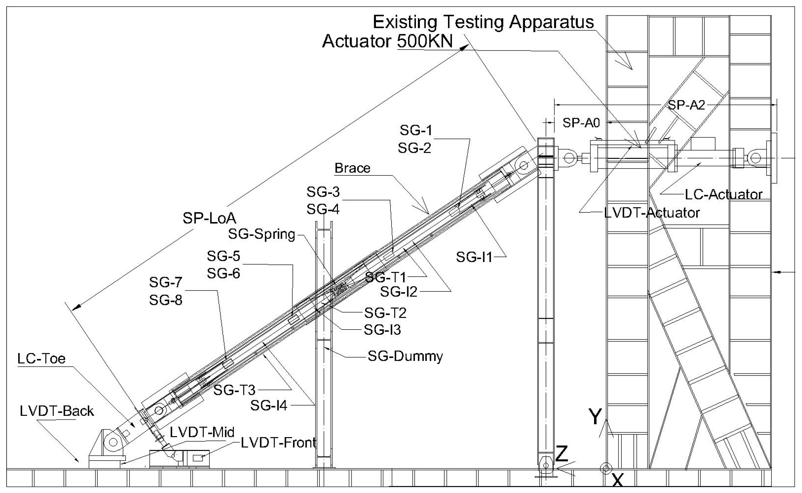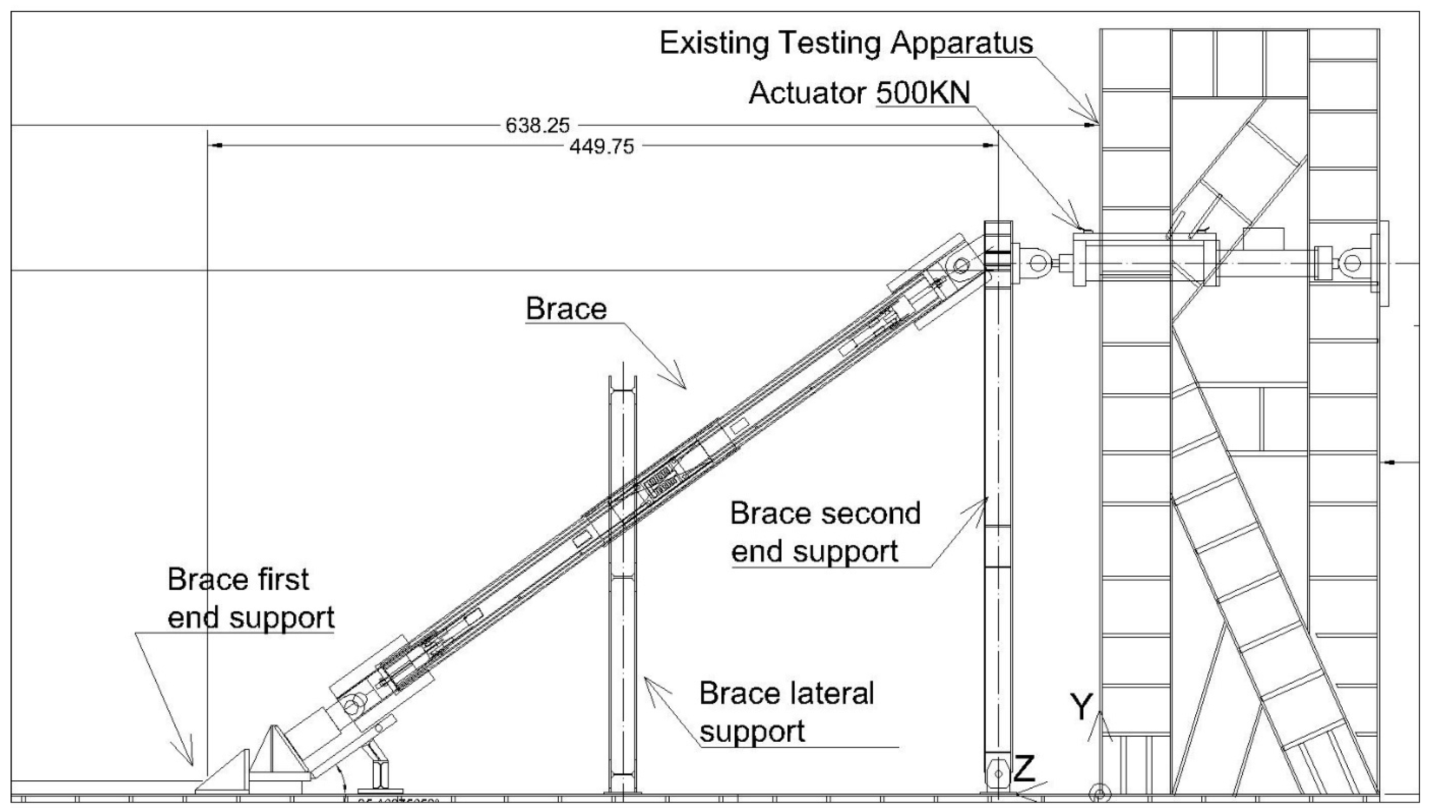 Figure 5 below. The test was conducted in a planar configuration constrained to the Y–Z directions. The hydraulic actuator applied cyclic forces along the Z-axis, thereby inducing controlled deformations in the brace. To replicate realistic building conditions, both the toe and tower’s support sections were fully fixed against movement in all directions. Both the tower and toe support are arranged so that the brace and the load cell remain colinear throughout the test. This alignment ensured that bending moments were not introduced on the load cell, which might affect the force reading. The support system was designed to allow only axial lengthening and shortening of the brace in-plane while prohibiting lateral translation of the brace’s top end.