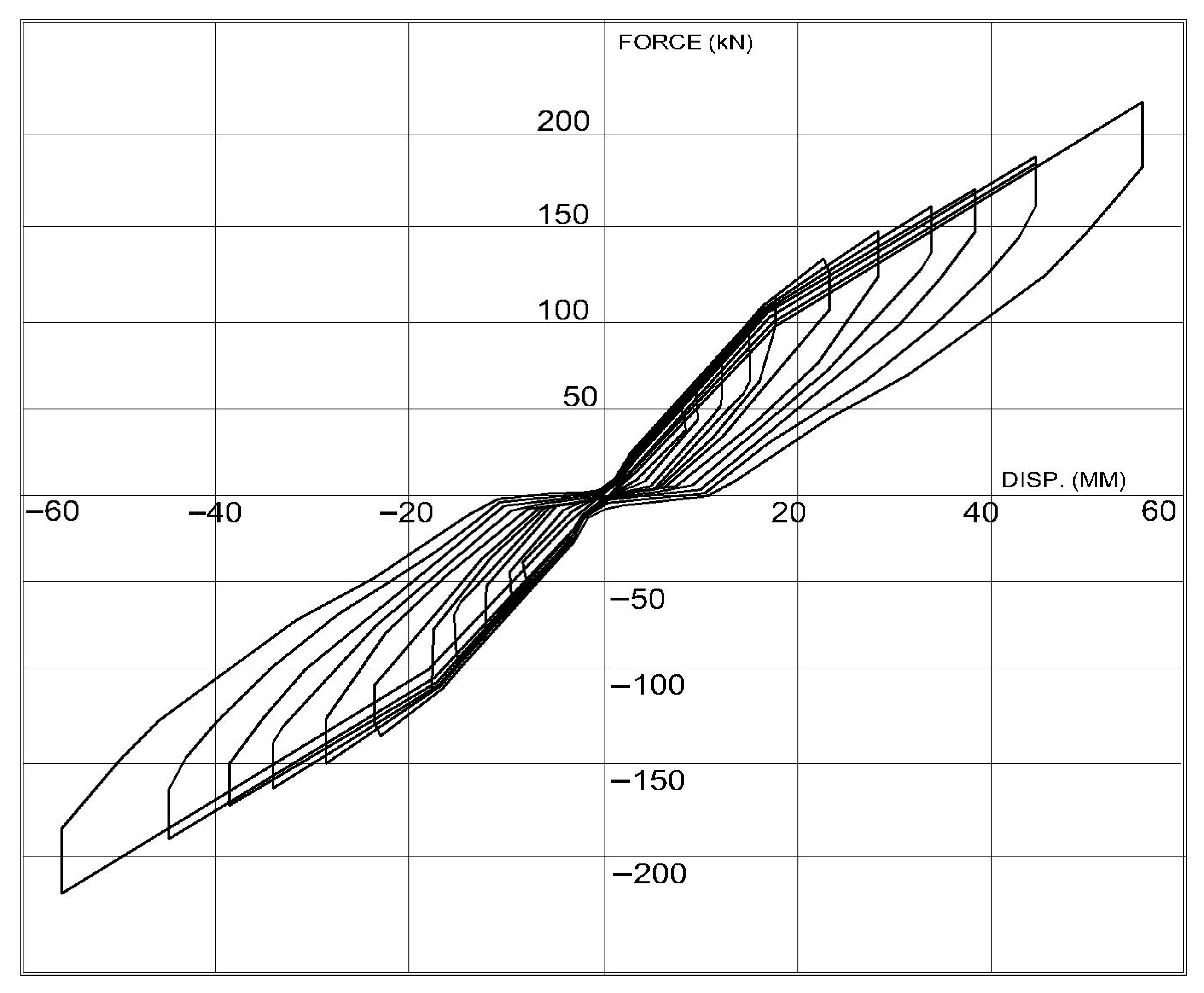 Figure 14. In this figure, energy dissipation portions are well separated, and the excess PT force pulls the brace back to its center after the UFPs’ plastic recovery is completed at approximately 22 mm (in the positive cycle). This elastic recovery is performed strictly by the PT force that is left in heavy-duty springs, as can be seen by the recovery stiffness being similar to the stiffness corresponding to the initial loading path. It is noted that the force-displacement curve stiffness drops when it passes approximately ±150 kN to a lower value, as the PT force is exceeded and the combined stiffness of the UFPs and springs comes into play. A summary plot, which includes an overlay of the hysteresis loops, is shown in