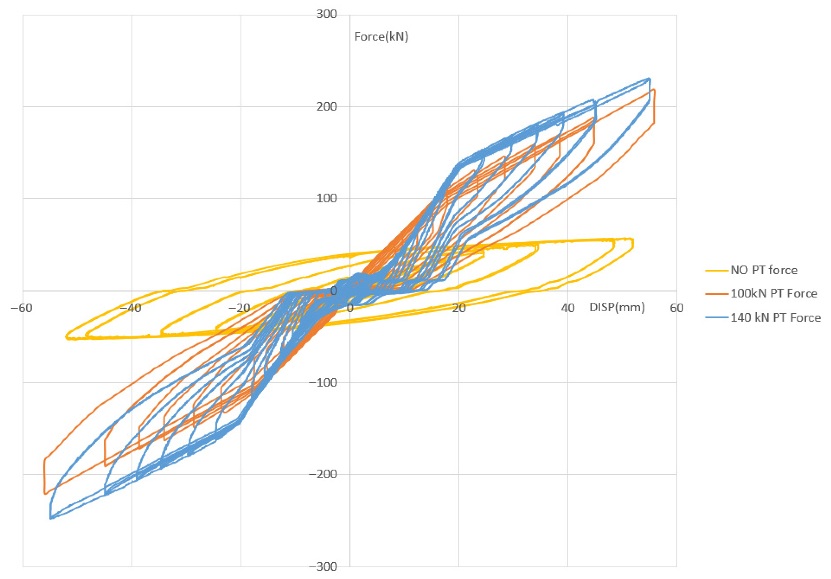 Figure 15. The overlay shows the benefit of PT force clearly, by means of pushing positive and negative loops apart and improving the elastic and plastic loading stiffnesses; the 60 kN plot is not included due to its plot being close to zero PT force.