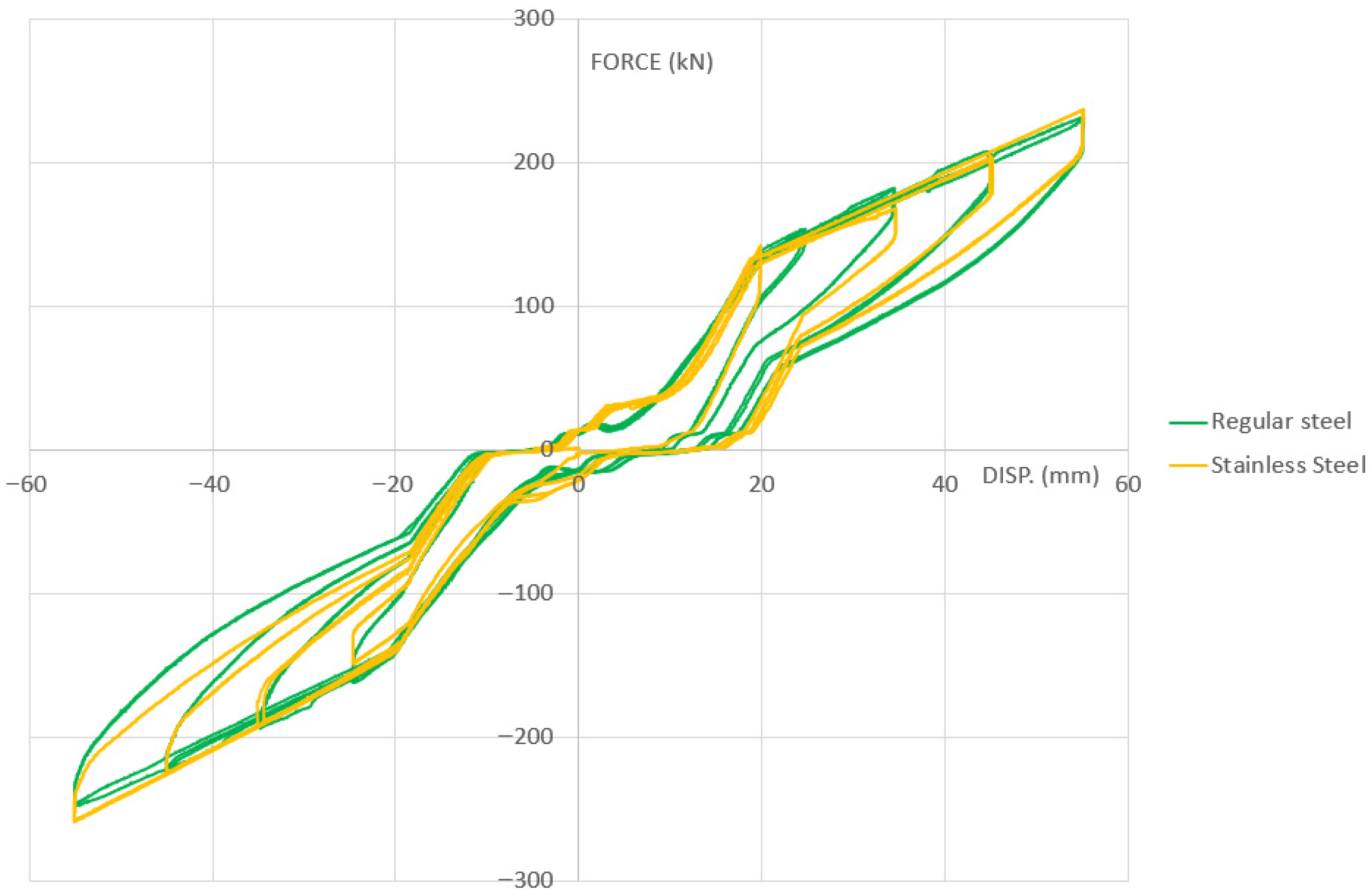 Figure 17). The force-displacement plot stiffness drops when it passes approximately ±150 kN to a lower value, as the PT force is exceeded, and the combined stiffness of the UFPs and springs are now the governing stiffness. The experimental test results clearly highlight the distinct behavioral differences between the two materials when subjected to cyclic loading. The data obtained show that regular steel UFPs consistently reach higher maximum force levels compared to UFPs made of stainless steel. However, regular steel UFPs demonstrate a slightly greater energy absorption capacity, as evidenced by the larger hysteretic loop areas obtained during the tests, indicating their ability to dissipate seismic energy through plastic deformation. In terms of stiffness, UFPs with regular steel exhibit a slightly higher initial stiffness, whereas stainless-steel UFPs have a slightly higher post-yield stiffness, which contributes to improved resistance against moderate-to-high displacement demands. Most importantly, especially for high displacement levels, stainless-steel UFPs displayed a significantly better recovery from plastic deformation, with low residual displacements, which improved the self-centering capability compared to UFPs made of regular steel. In addition, it is a known fact that stainless steel has a significantly longer lifetime in comparison to regular steel. This is also shown with this test program, as the braces with regular steel samples, UFPs started to break towards the end cycles (cycles 14 through 16); in half of the tests, UFPs made of regular steel failed by rupturing. These experimentally validated findings emphasize the complementary strengths of both materials, underscoring the importance of material selection in the design of seismic energy dissipation and self-centering systems. Both materials exhibit similar force levels given that there is a considerable difference between their yield strengths.