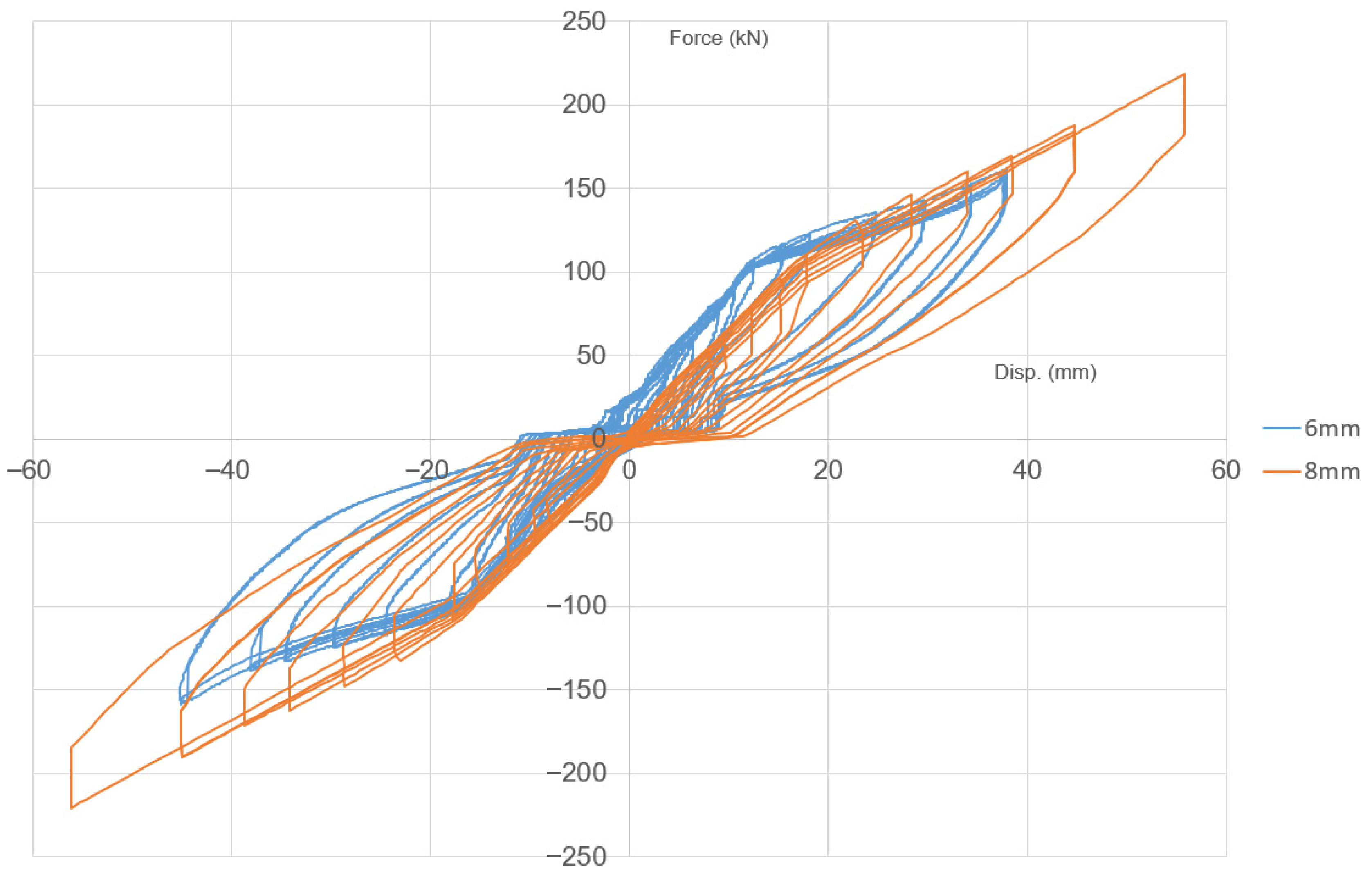 Tests were performed on a brace specimen having 8 count, 6 mm stainless-steel UFP plates subjected to a post-tensioning (PT) force of 100 kN, and